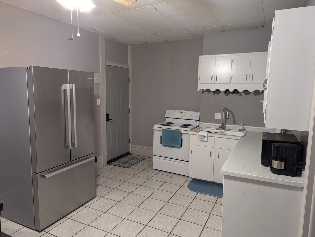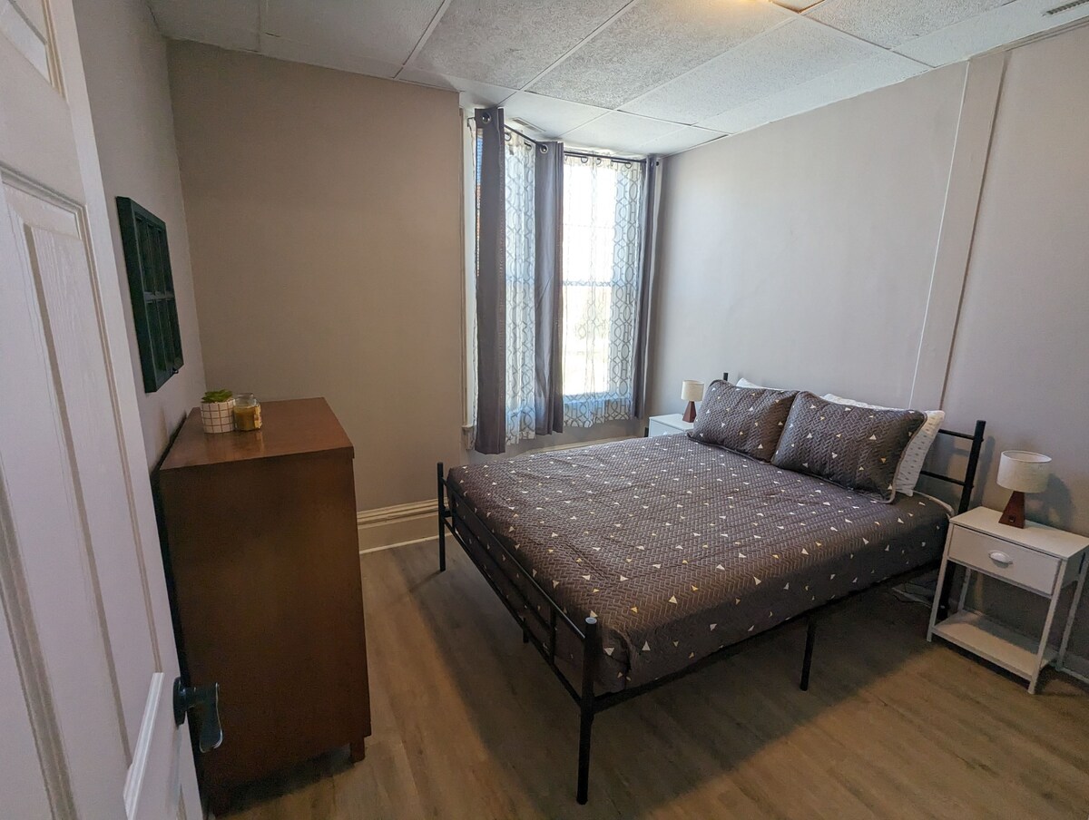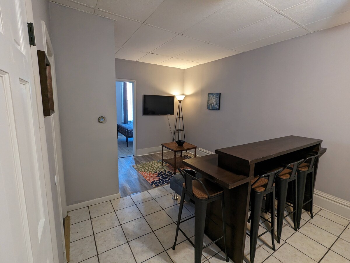 Welcome to our charming 2-bedroom apartment nestled within a historic gem of a building in the heart of Robinson. This delightful Airbnb offers a unique blend of old-world charm and modern comfort, making it the perfect retreat whether you are visiting family, staying for work, or seeking a peaceful getaway. The apartment boasts an open floor plan, combining the living room, kitchen, and dining area into a welcoming and versatile space. Relax with Roku TV and high speed Wifi. Large windows in the bedrooms open to a view of the town square. The fully equipped kitchen features essential appliances and cookware, providing everything you need to prepare delicious meals and enjoy them in the adjacent dining area. The open layout allows for a seamless flow between the different areas of the apartment. The apartment offers two inviting bedrooms, each thoughtfully designed to provide a comfortable night's sleep. Both bedrooms feature queen-sized beds, with a futon couch in the living room for an additional guest. The spacious bathroom features a full bathtub and shower combination, fresh towels, and essential toiletries. Whether you prefer a quick morning shower or a relaxing soak in the tub after a long day, this bathroom provides a rejuvenating oasis. This Airbnb is conveniently located near major employers in the area, including Marathon and Hershey. During your stay, take a leisurely stroll through the town's picturesque streets, where you'll discover charming boutiques, historic landmarks, and friendly locals. Whether you're here for work or relaxation, it promises a memorable stay filled with comfort, tranquility, and a touch of nostalgia. Book your stay today and immerse yourself in the unique charm of this hidden gem.