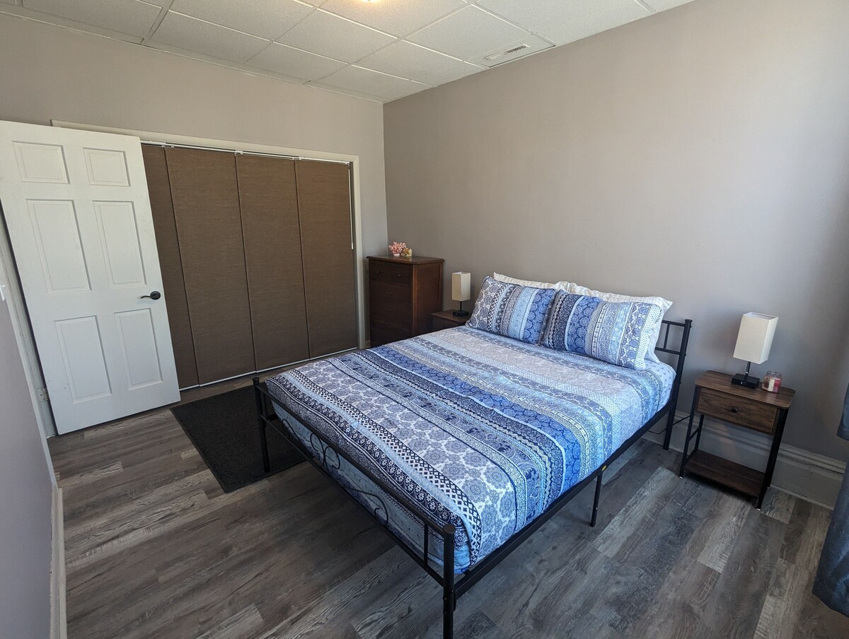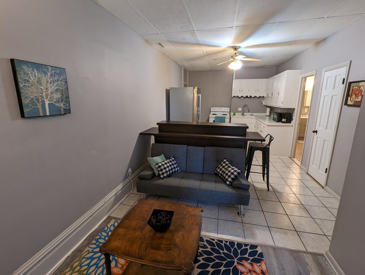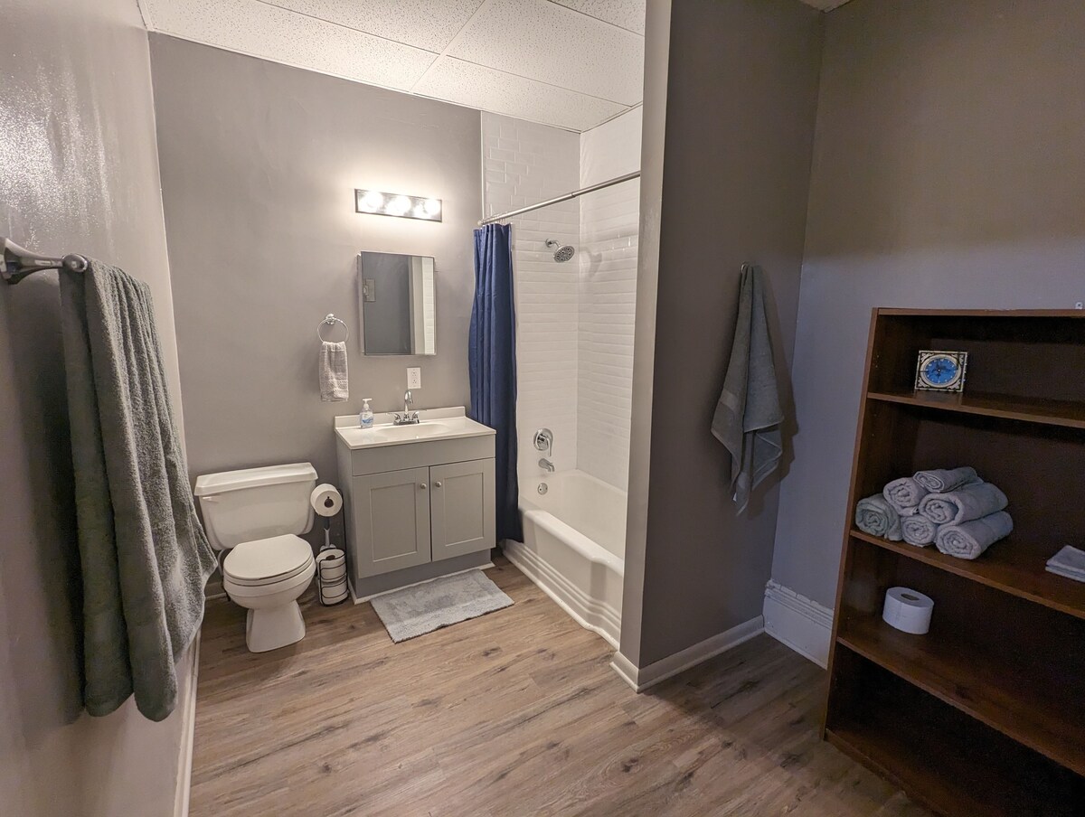 Welcome to our charming 2-bedroom apartment nestled within a historic gem of a building in the heart of Robinson. This delightful Airbnb offers a unique blend of old-world charm and modern comfort, making it the perfect retreat whether you are visiting family, staying for work, or seeking a peaceful getaway. The apartment boasts an open floor plan, combining the living room, kitchen, and dining area into a welcoming and versatile space. Relax with Roku TV and high speed Wifi. Large windows in the bedrooms open to a view of the town square. The fully equipped kitchen features essential appliances and cookware, providing everything you need to prepare delicious meals and enjoy them in the adjacent dining area. The open layout allows for a seamless flow between the different areas of the apartment. The apartment offers two inviting bedrooms, each thoughtfully designed to provide a comfortable night's sleep. Both bedrooms feature queen-sized beds, with a futon couch in the living room for an additional guest. The spacious bathroom features a full bathtub and shower combination, fresh towels, and essential toiletries. Whether you prefer a quick morning shower or a relaxing soak in the tub after a long day, this bathroom provides a rejuvenating oasis. This Airbnb is conveniently located near major employers in the area, including Marathon and Hershey. During your stay, take a leisurely stroll through the town's picturesque streets, where you'll discover charming boutiques, historic landmarks, and friendly locals. Whether you're here for work or relaxation, it promises a memorable stay filled with comfort, tranquility, and a touch of nostalgia. Book your stay today and immerse yourself in the unique charm of this hidden gem.